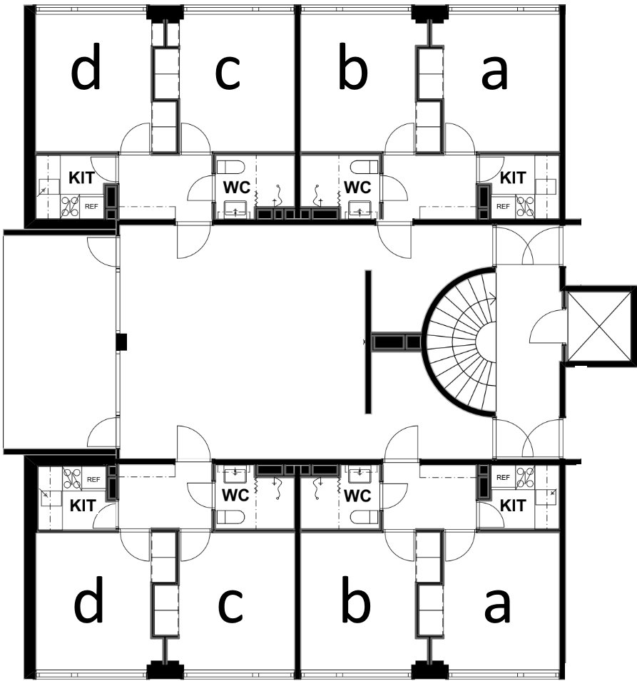 There are eight lockable private bedrooms on each floor, so the maximum number of people sharing an apartment on the same floor is eight. You can take a look at the floor plan of the apartment below.